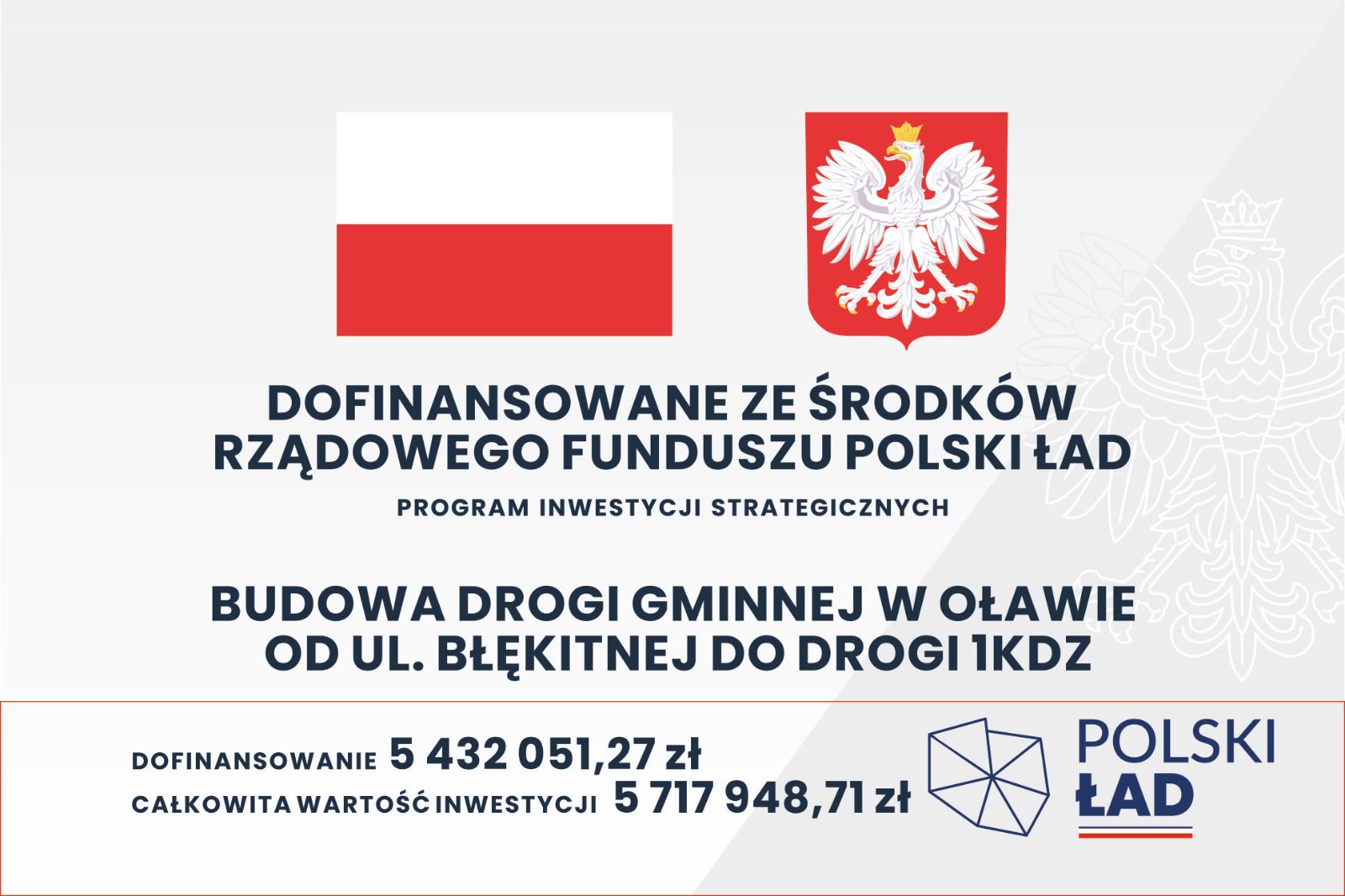 Całkowita wartość inwestycji wyniosła 5 806 060,21 PLN, w tym dofinansowanie ze środków Rządowego Funduszu Polski Ład Program Inwestycji Strategicznych - 5 432 051,27 PLN. Dodatkowo zadanie uzyskało wsparcie ze środków Rządowego Funduszu Rozwoju Dróg w kwocie 320 442,97 PLN.