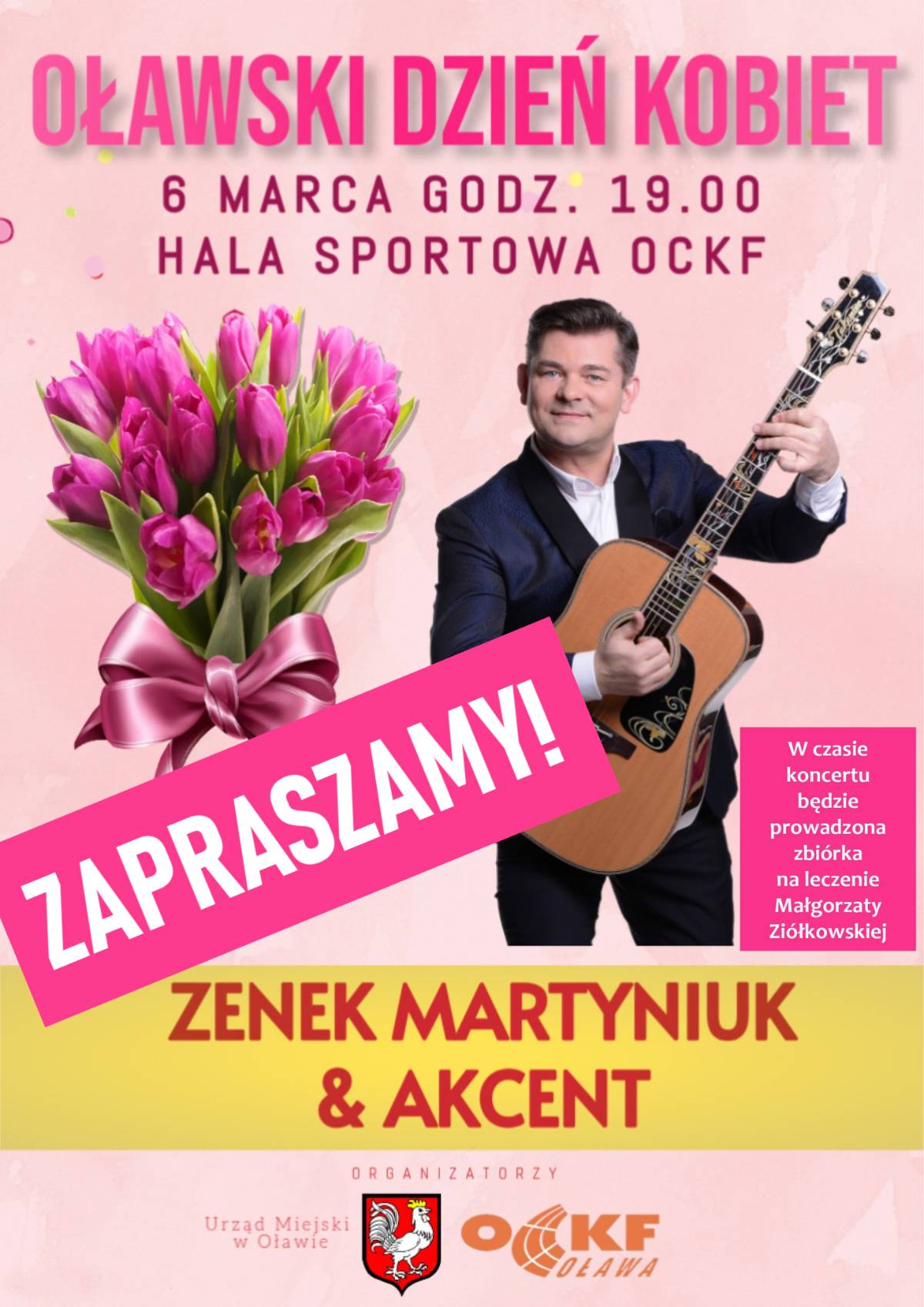 Mamy niespodziankę z okazji zbliżającego się Dnia Kobiet! Zapraszamy Panie na koncert Zenka Martyniuka z zespołem Akcent, który odbędzie się 6 marca (piątek) o godz. 19.00 w hali sportowej Oławskie Centrum Kultury Fizycznej. Dystrybucja bezpłatnych wejściówek była prowadzona od poniedziałek 23 lutego w kilku punktach na terenie miasta (Wydział Promocji, Kultury i Sportu, Urząd Miejski w Oławie, Centrum Sztuki w Oławie, Oławskie Centrum Seniora, Biblioteka oraz OCKF). Poniżej zamieszczamy regulamin wydarzenia:
